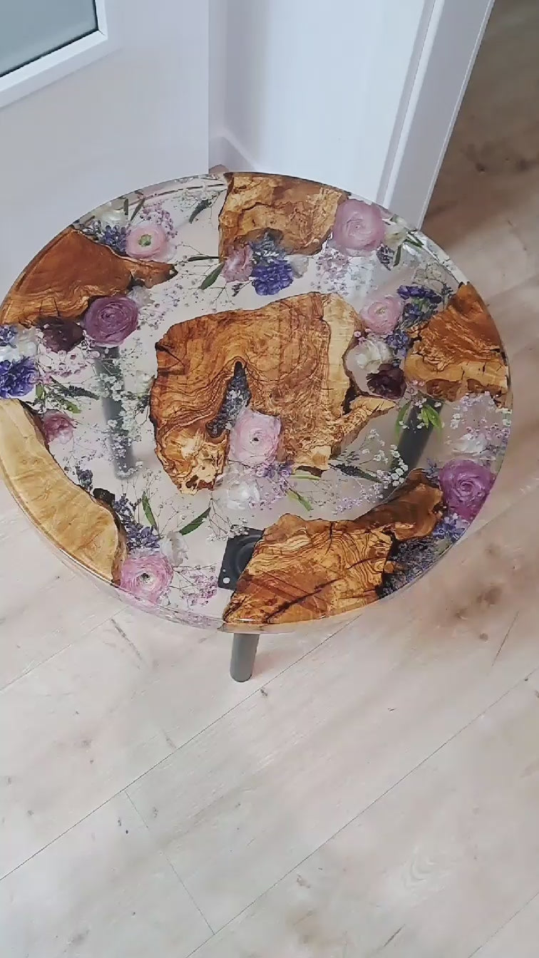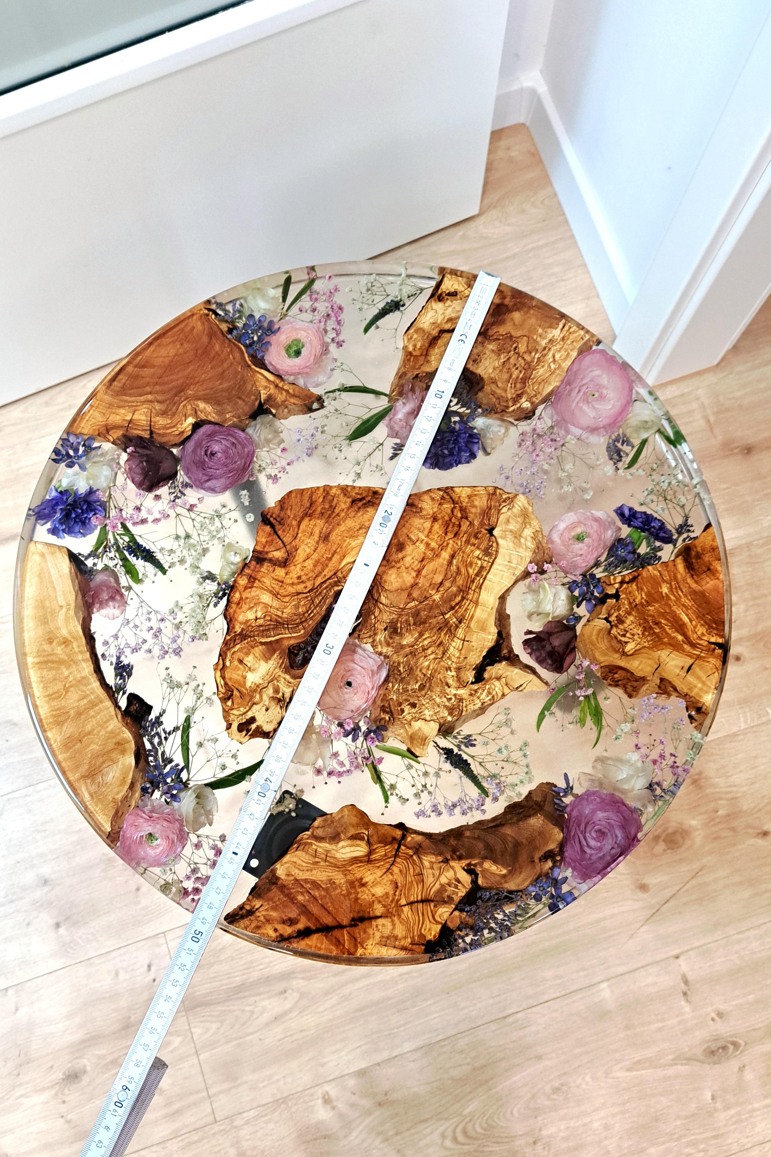 Wunderschöner Beistell-Tisch, in den die getrockneten Blumen eingearbeitet werden,