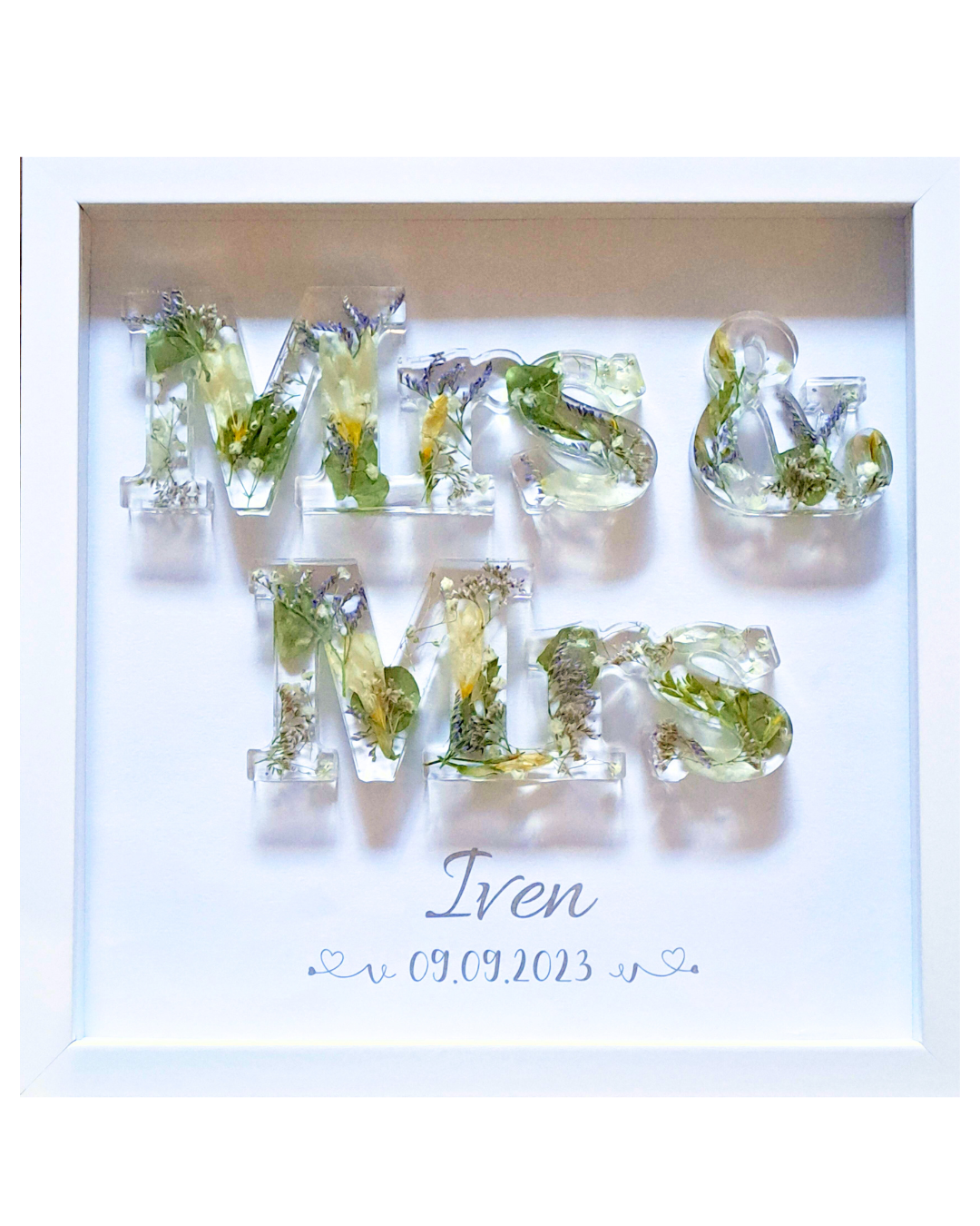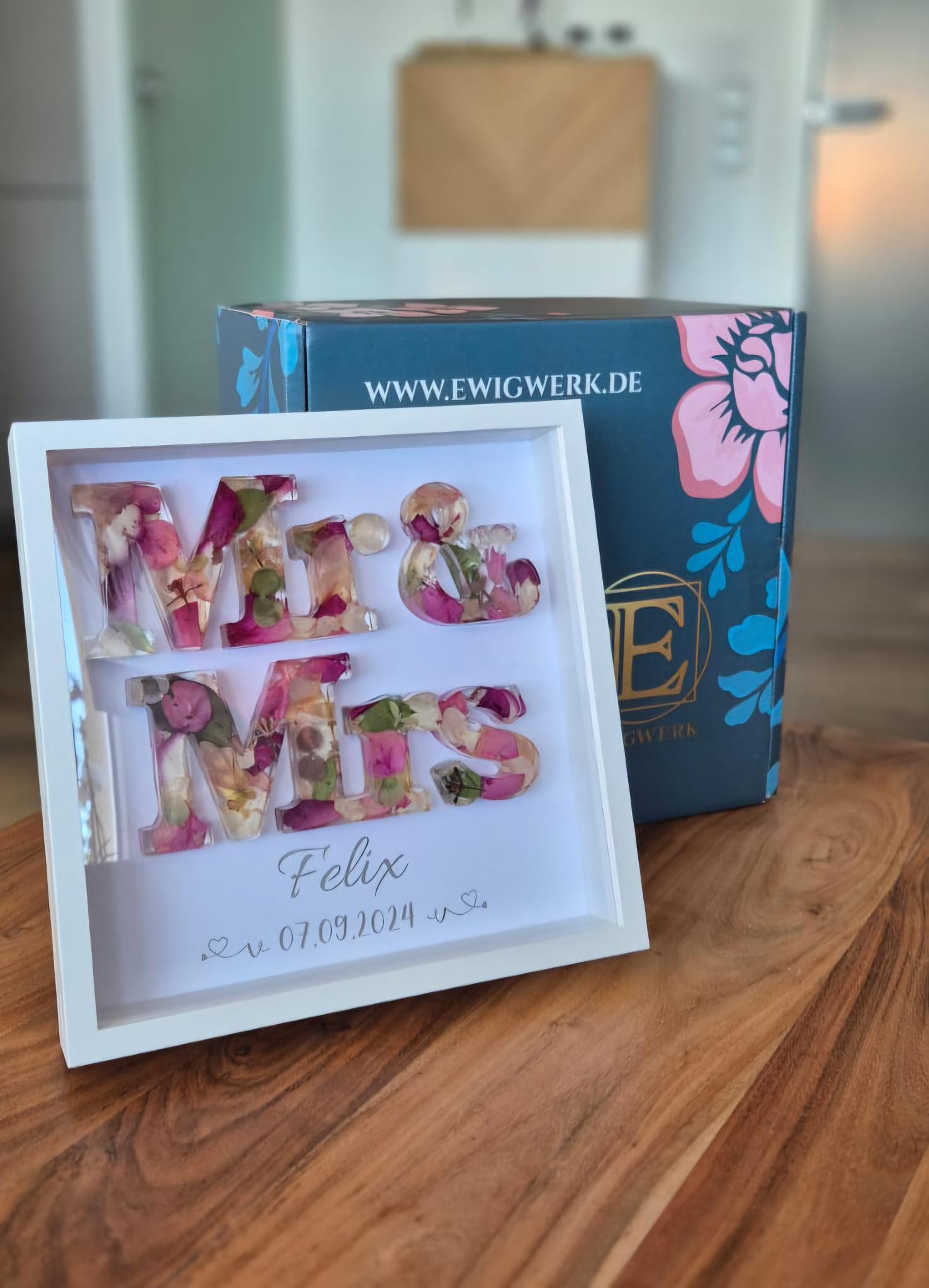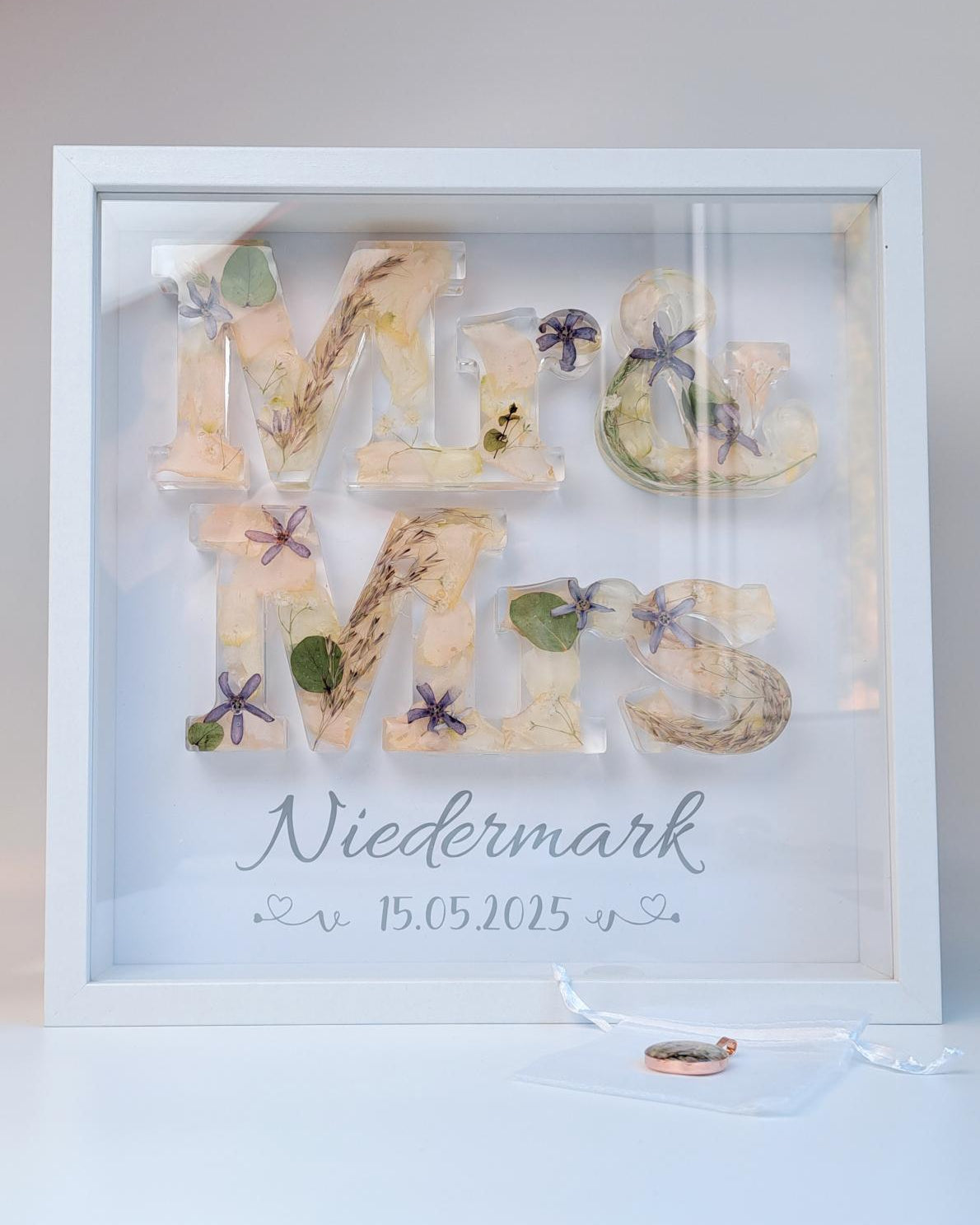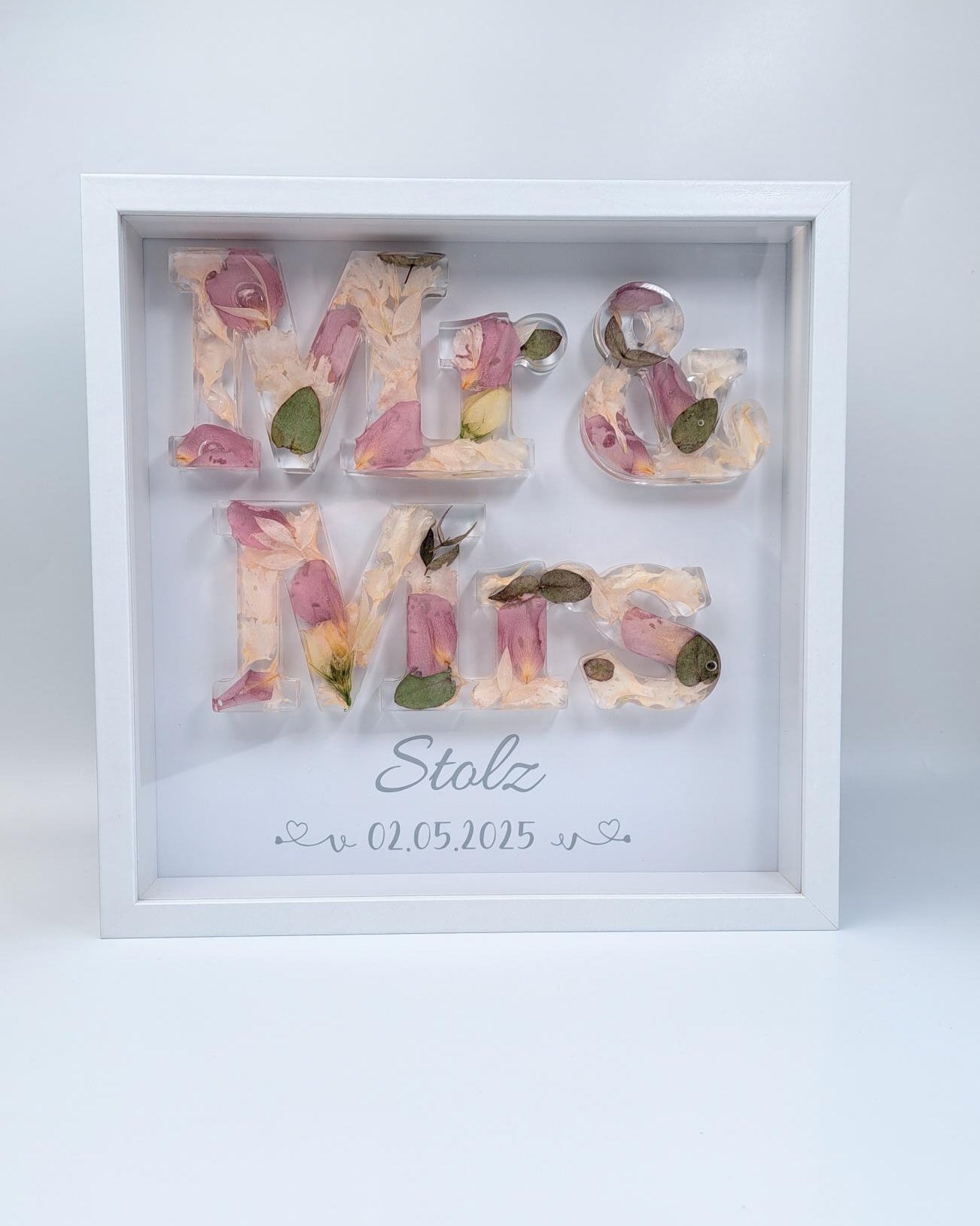 Bilderrahmen mit dem Schriftzug "Mr & Mrs", "Mrs & Mrs" oder "Mr & Mr" aus Epoxidharz mit eingearbeiteten, getrockneten Blütenblättern aus dem eigenen Brautstrauß mit zusätzlicher Beschriftung des Familiennamens und des Hochzeitsdatums. Rahmen in weiß, Beschriftung in Silber. Abmessungen des Rahmens: 25x25 cm. Dauer bis zur Fertigstellung: ca. 5-6 Monate ab Eingang der Blumen bei uns.