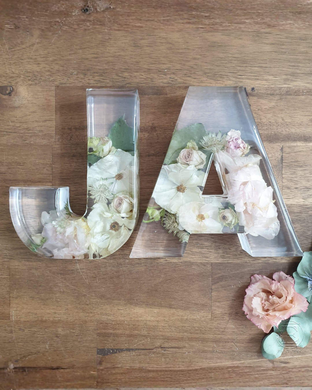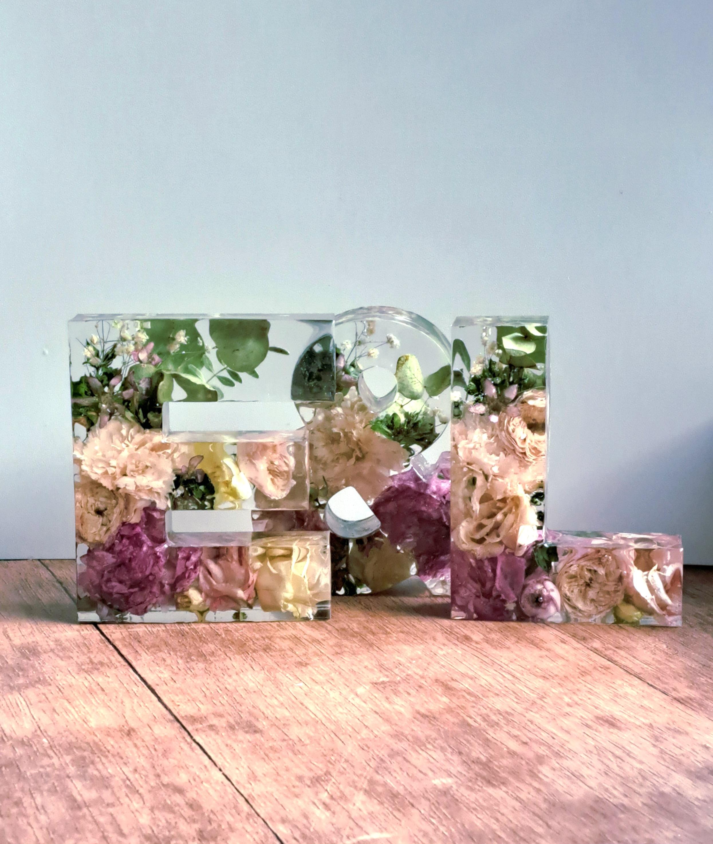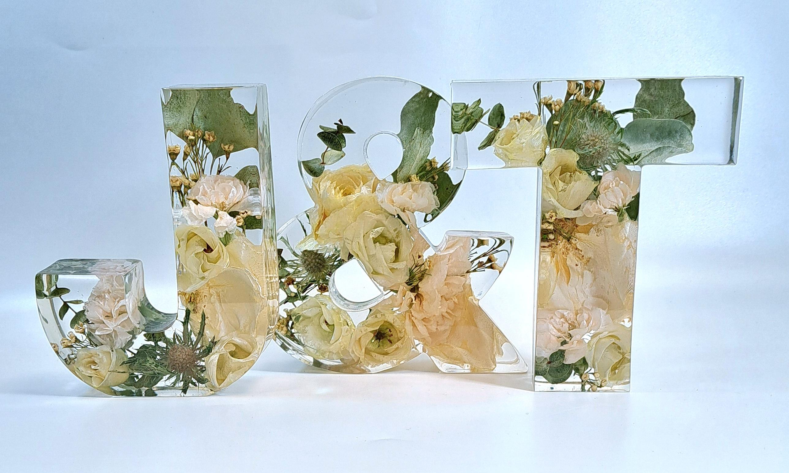 Buchstabe aus Epoxidharz mit eingearbeiteten, getrockneten Blumen aus dem eigenen Brautstrauß. Die Buchstaben sind ca. 15 cm hoch und ca. 3,5 cm tief. Die Breite variiert je nach Buchstabe.