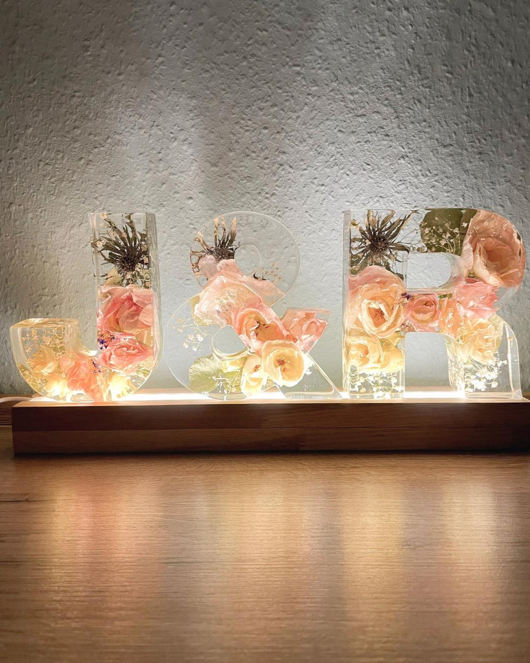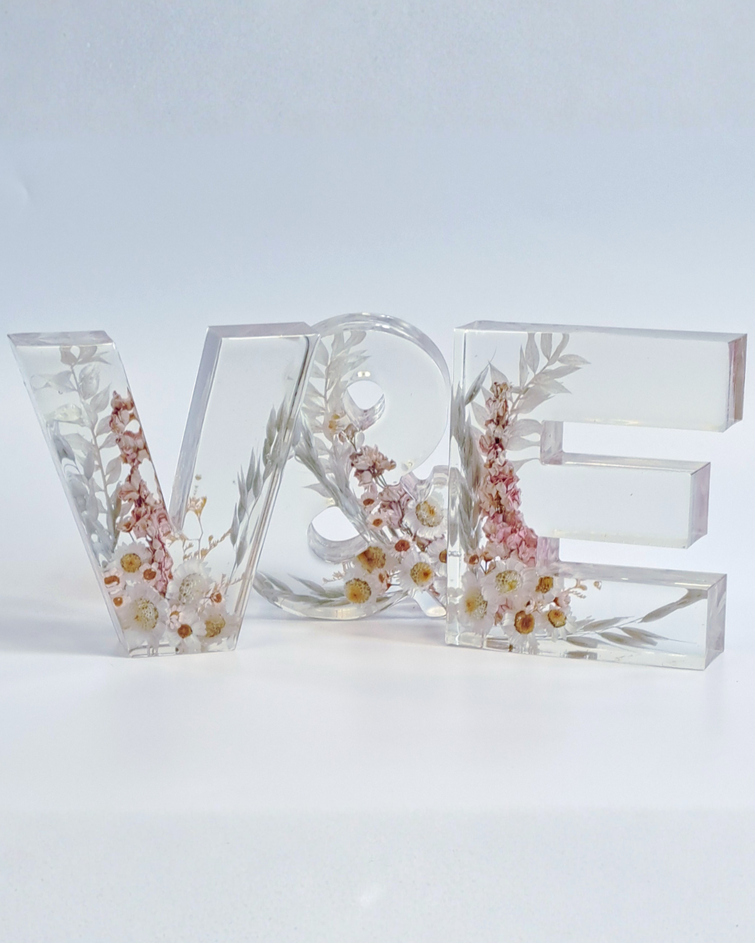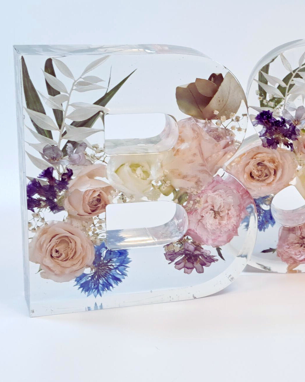 Buchstabe aus Epoxidharz mit eingearbeiteten, getrockneten Blumen aus dem eigenen Brautstrauß. Die Buchstaben sind ca. 15 cm hoch und ca. 3,5 cm tief. Die Breite variiert je nach Buchstabe.