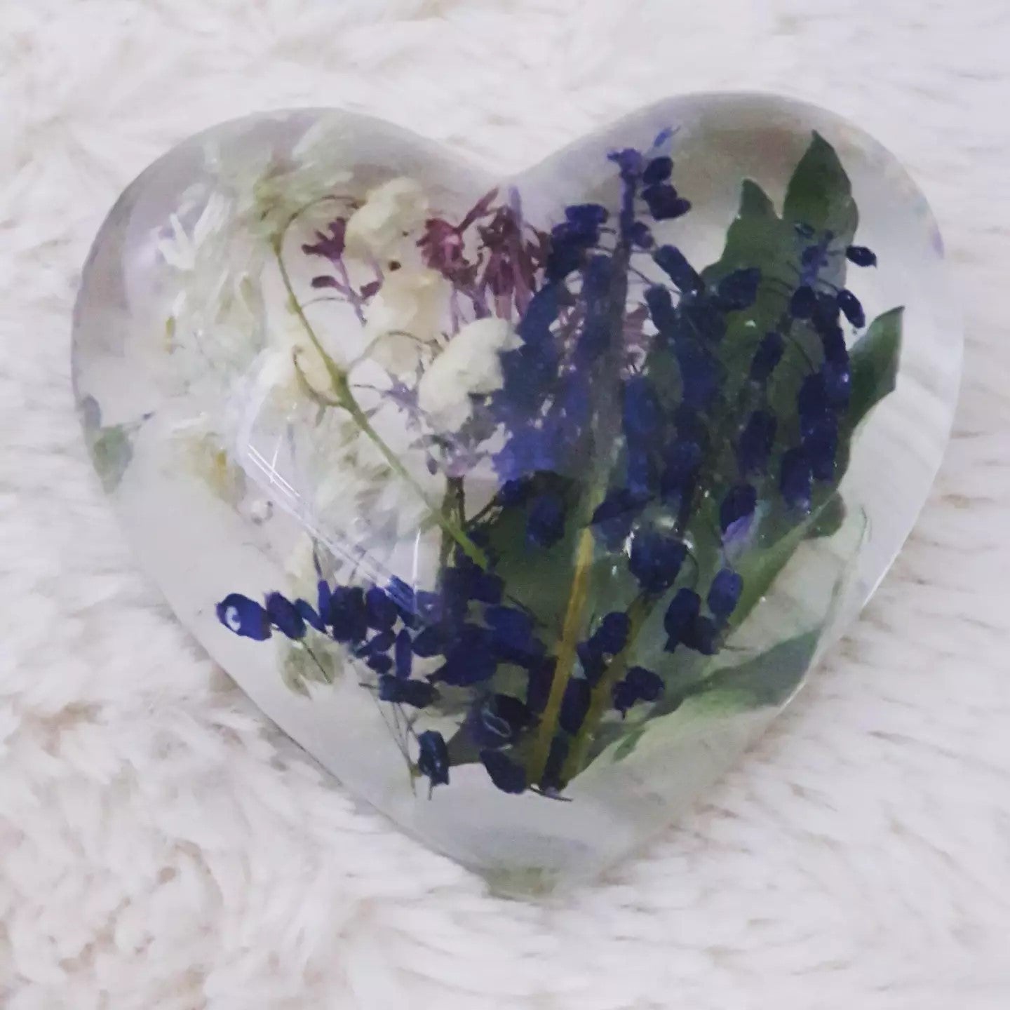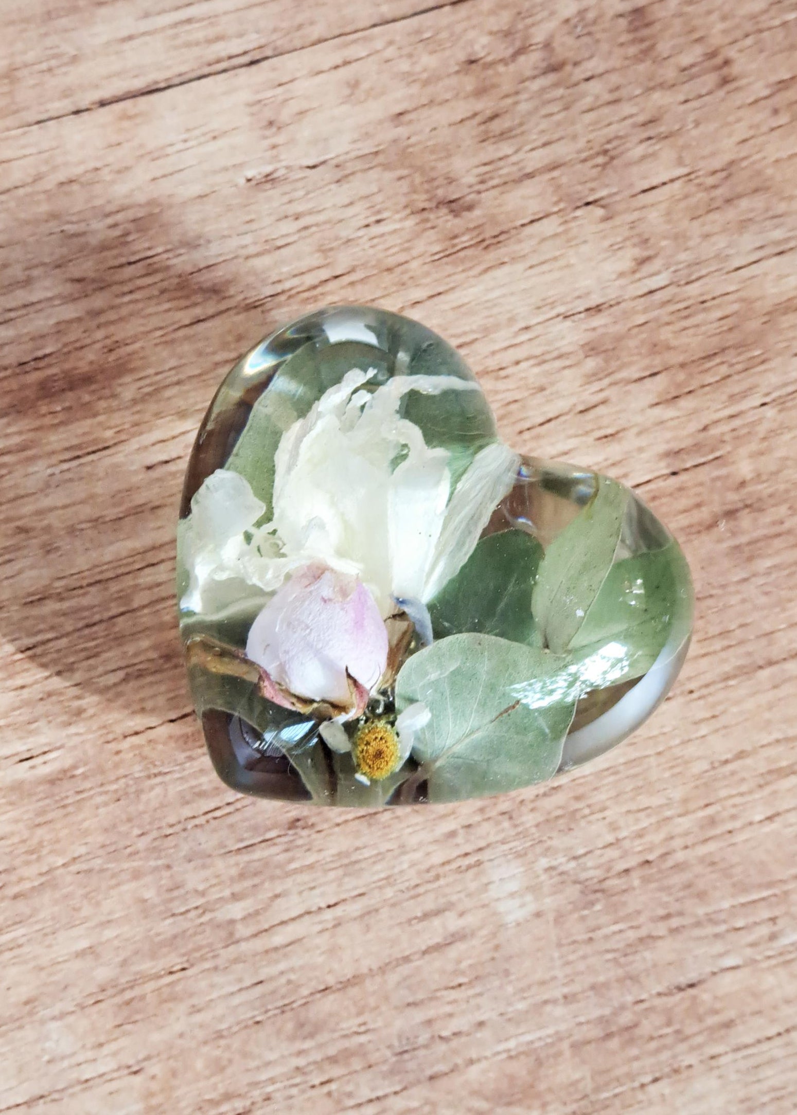Handschmeichler aus Epoxidharz mit eingearbeiteten, getrockneten Blüten aus dem eigenen Brautstrauß. Da in die Form nur wenige, kleine Blüten passen, kann er nur als Add-On gebucht werden. Dauer bis zur Fertigstellung: ca. 5-6 Monate ab Eingang der Blumen bei uns.
