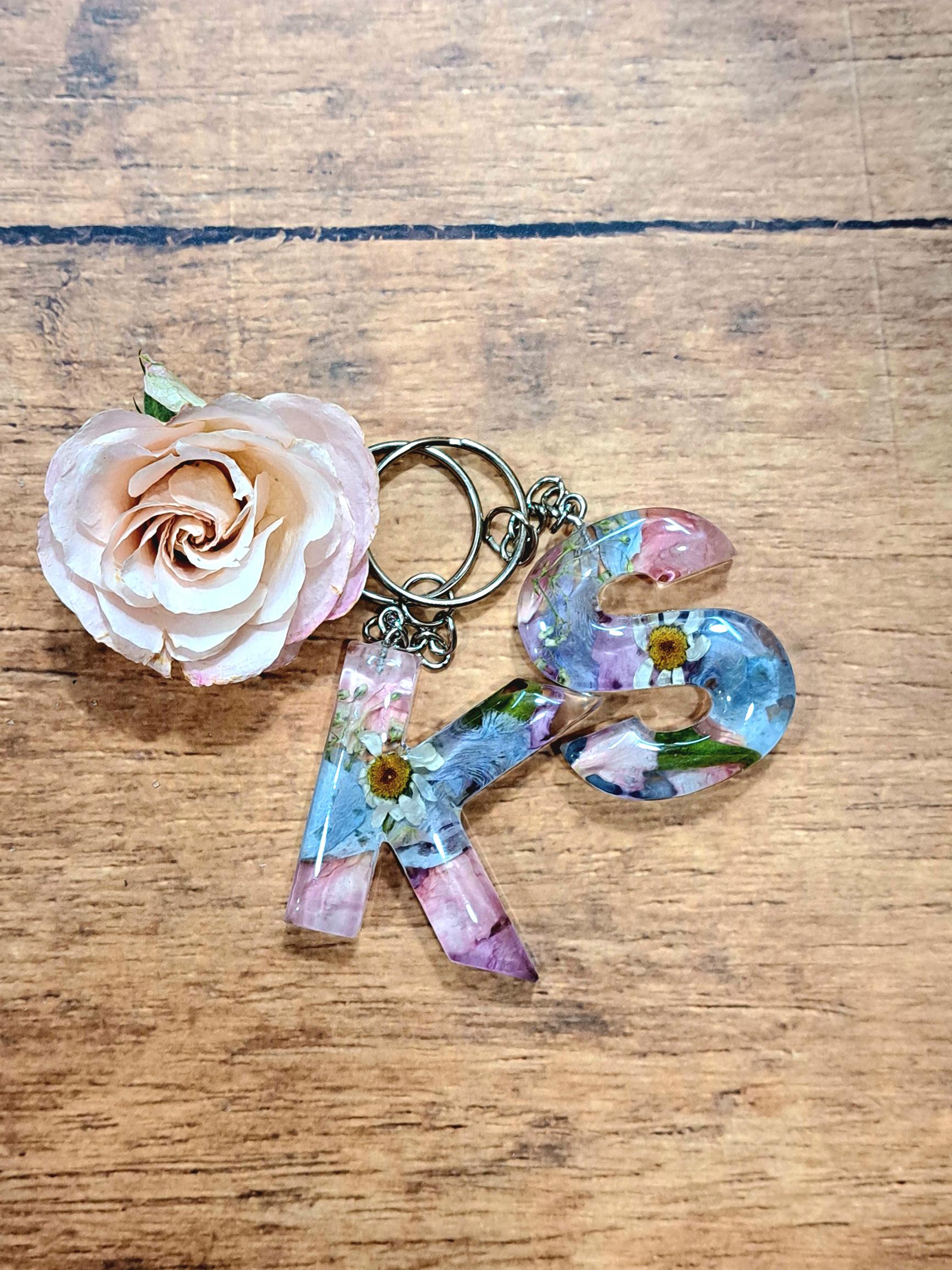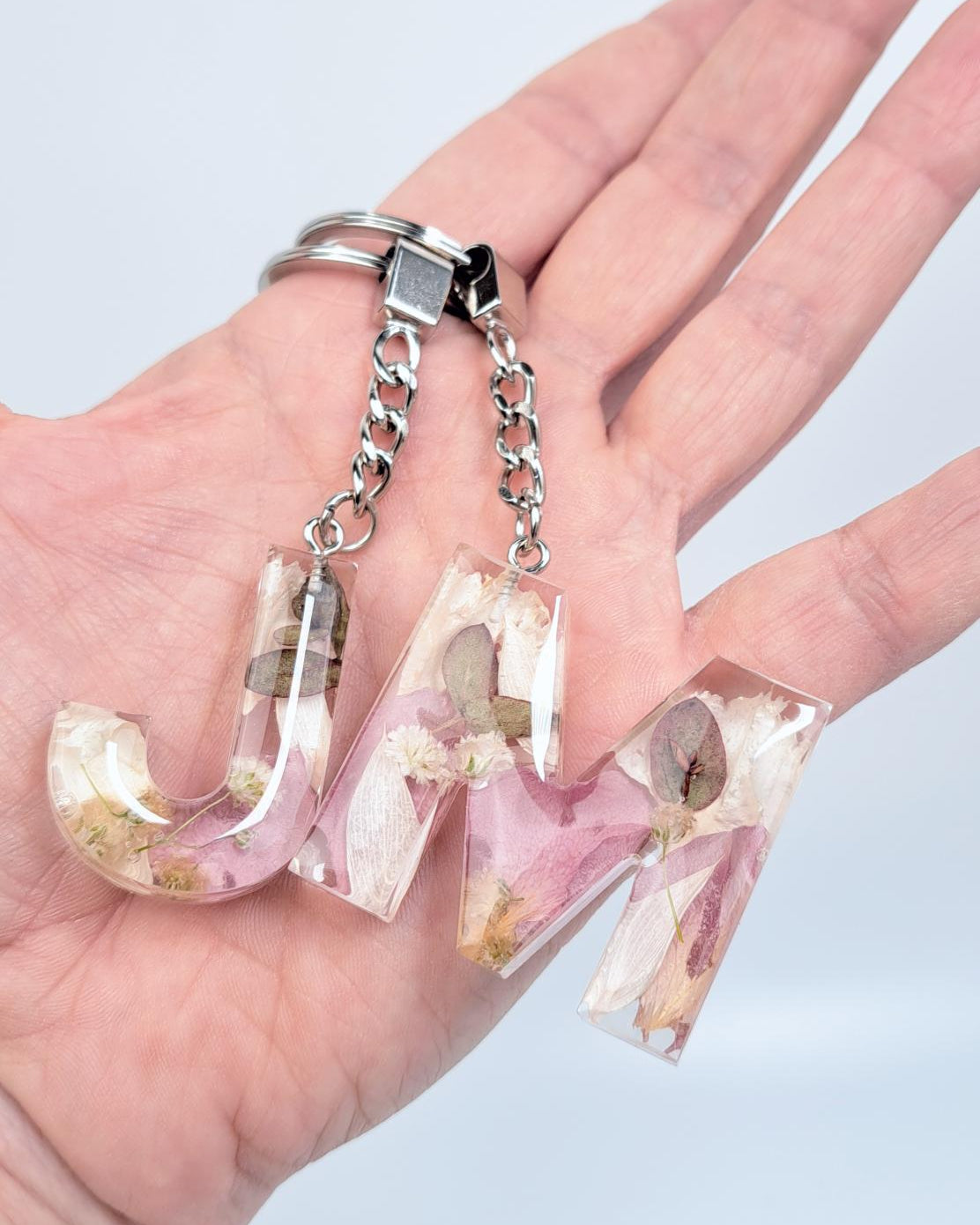 2 Stück Schlüsselanhänger aus Epoxidharz mit eingearbeiteten, getrockneten Blüten aus dem eigenen Brautstrauß.