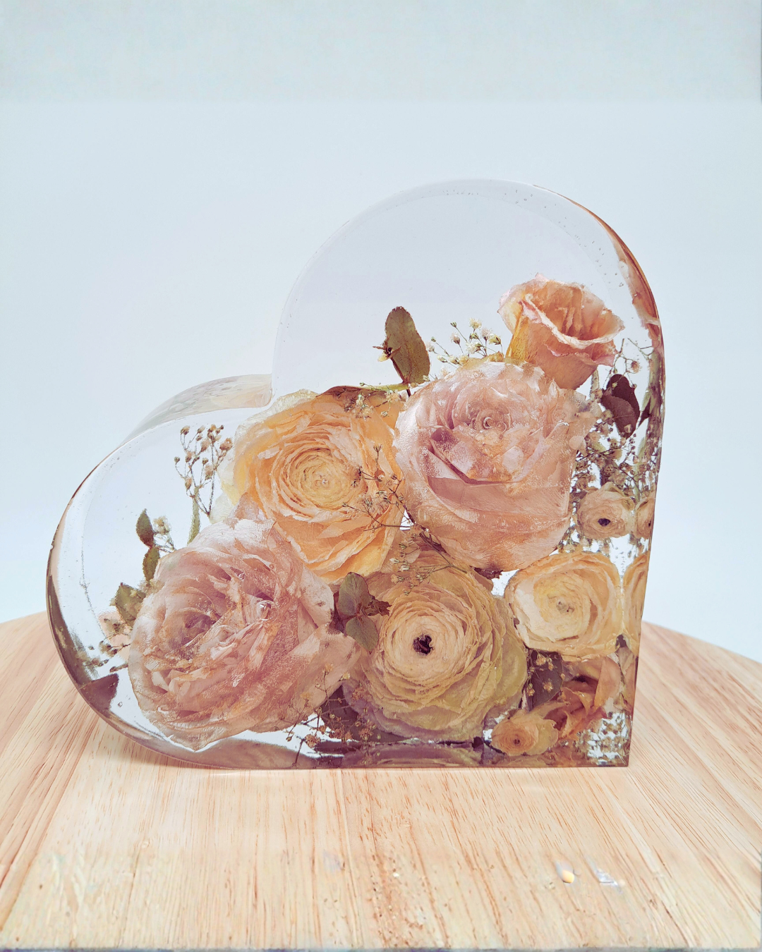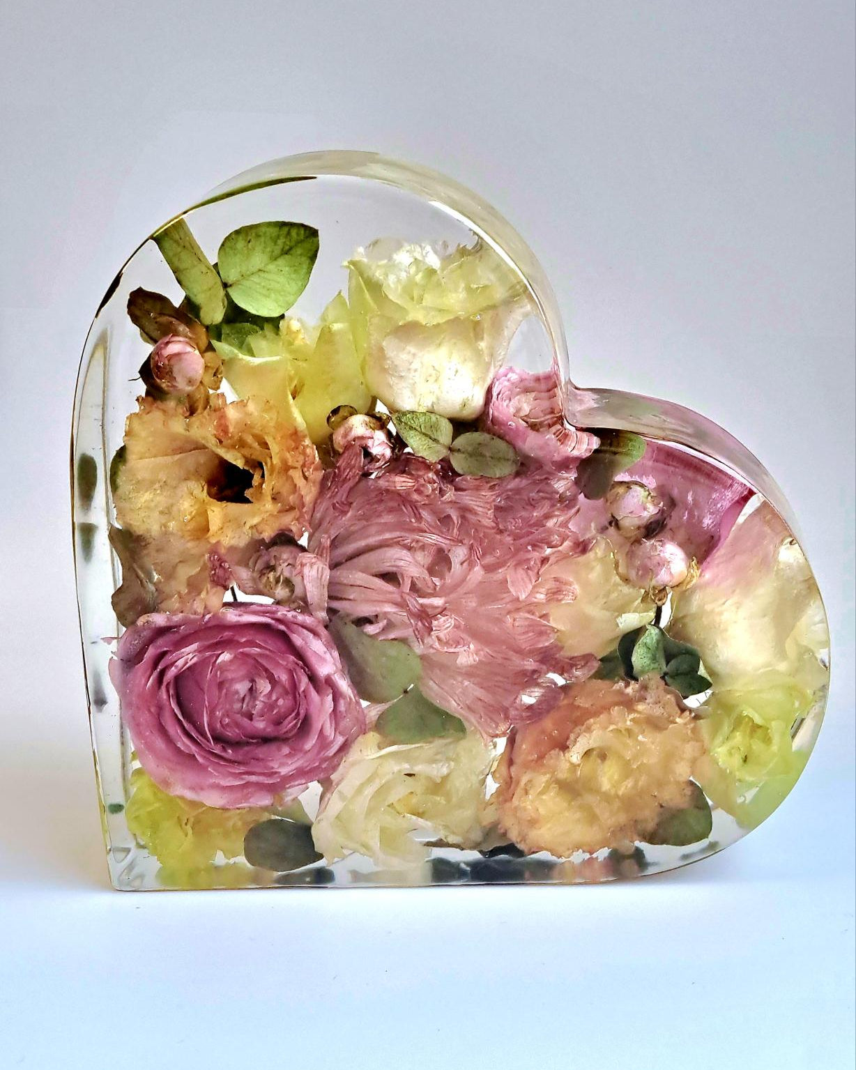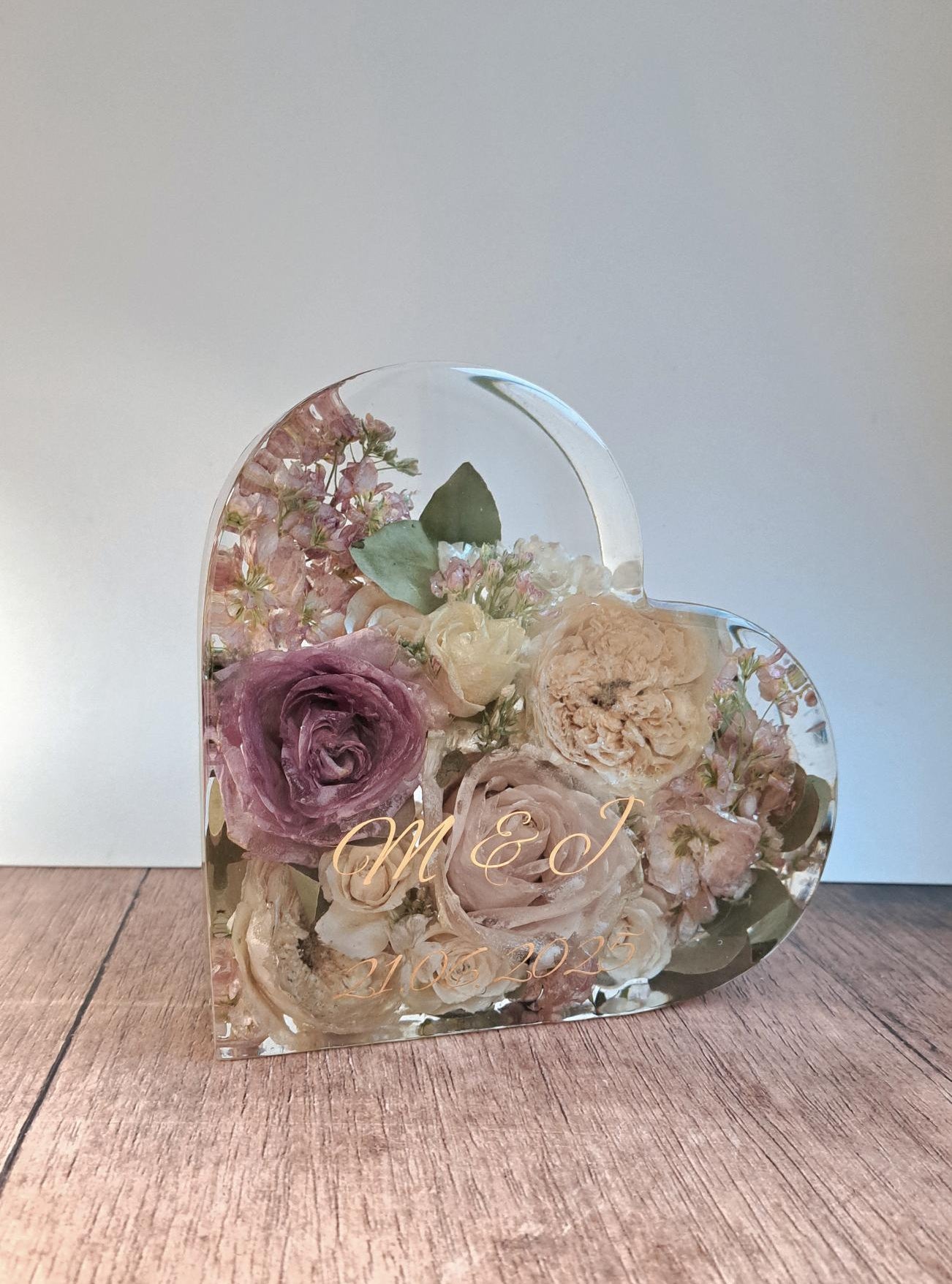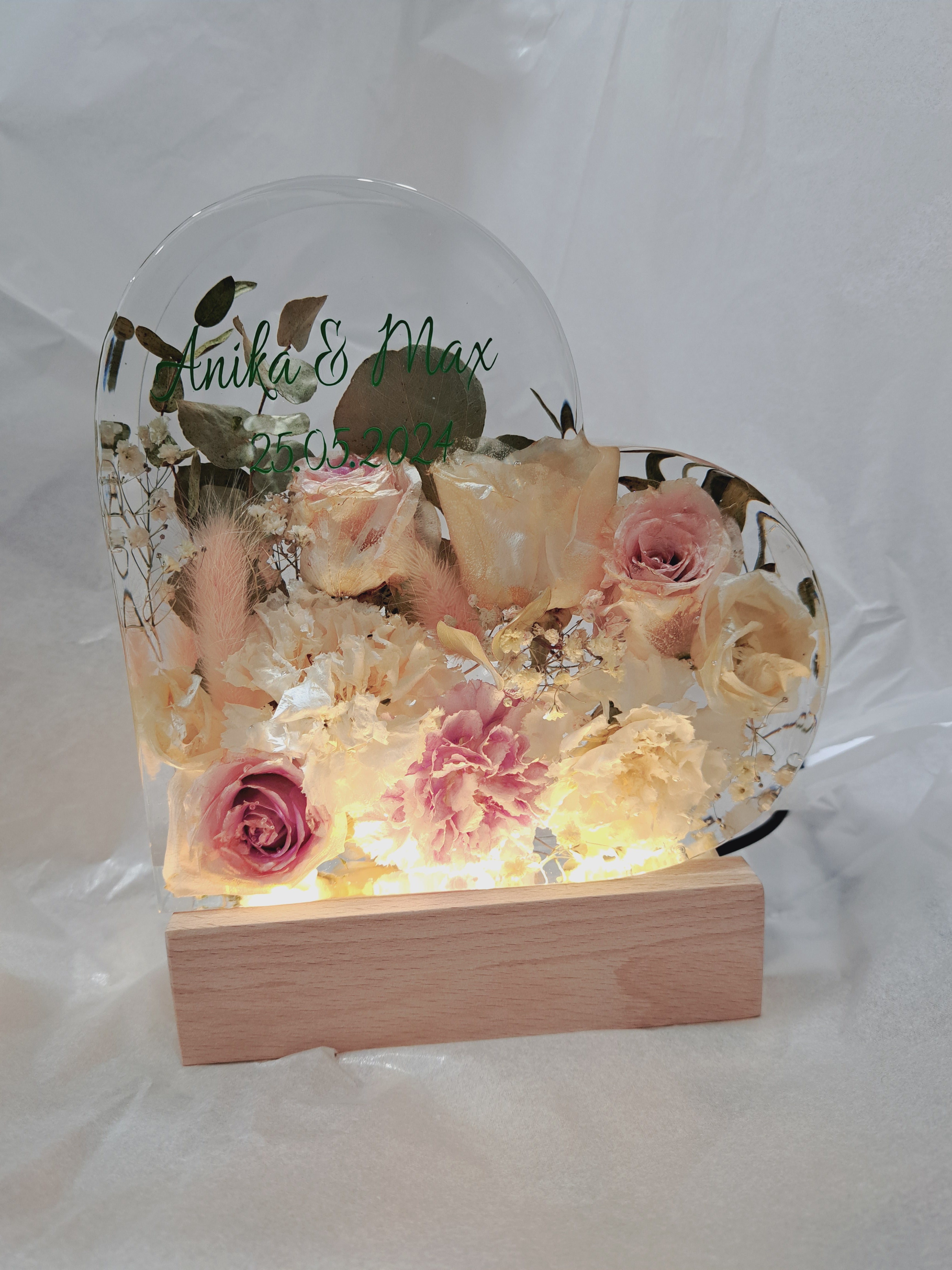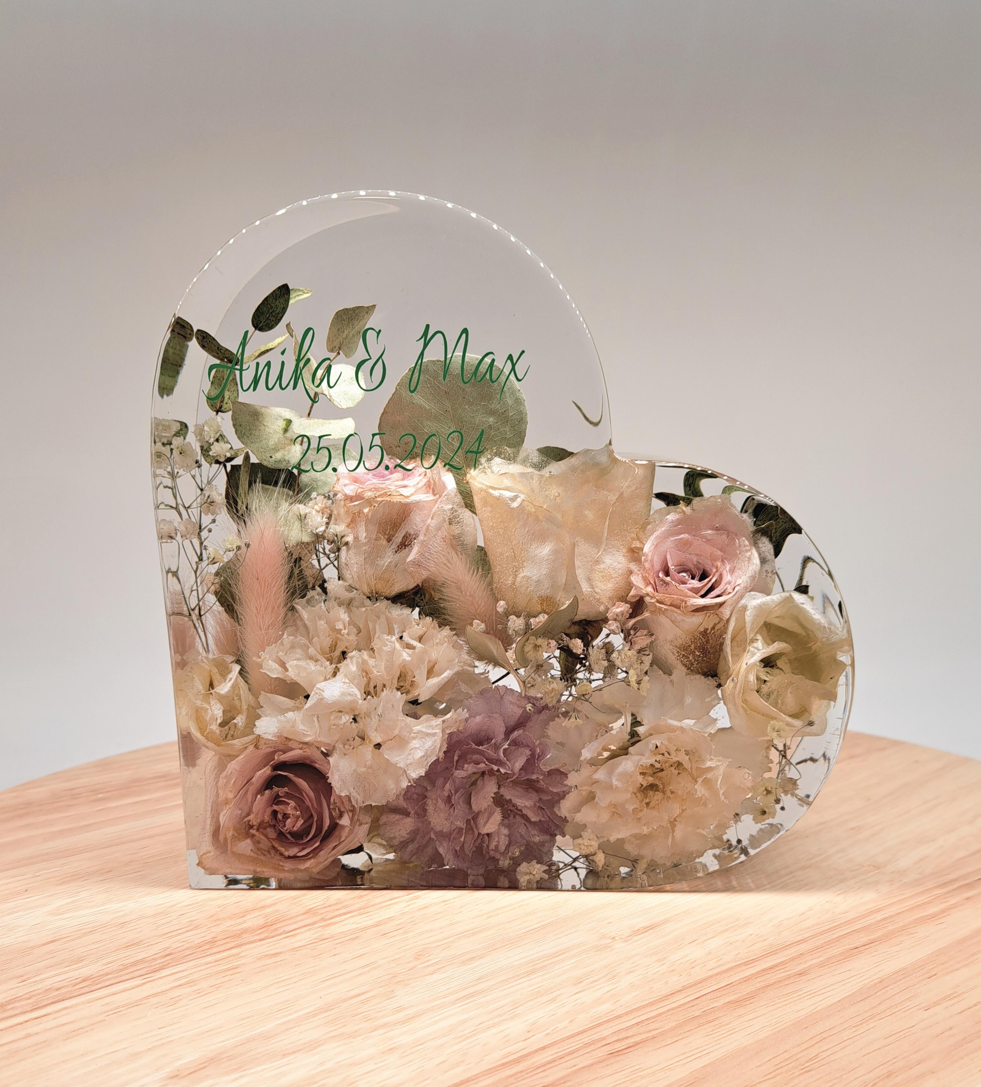 Große Herzform aus Epoxidharz mit eingearbeiteten, getrockneten Blumen aus dem eigenen Brautstrauß. Abmessungen ca. 13x17 cm. Dauer bis zur Fertigstellung: ca. 5-6 Monate ab Eingang der Blumen bei uns.