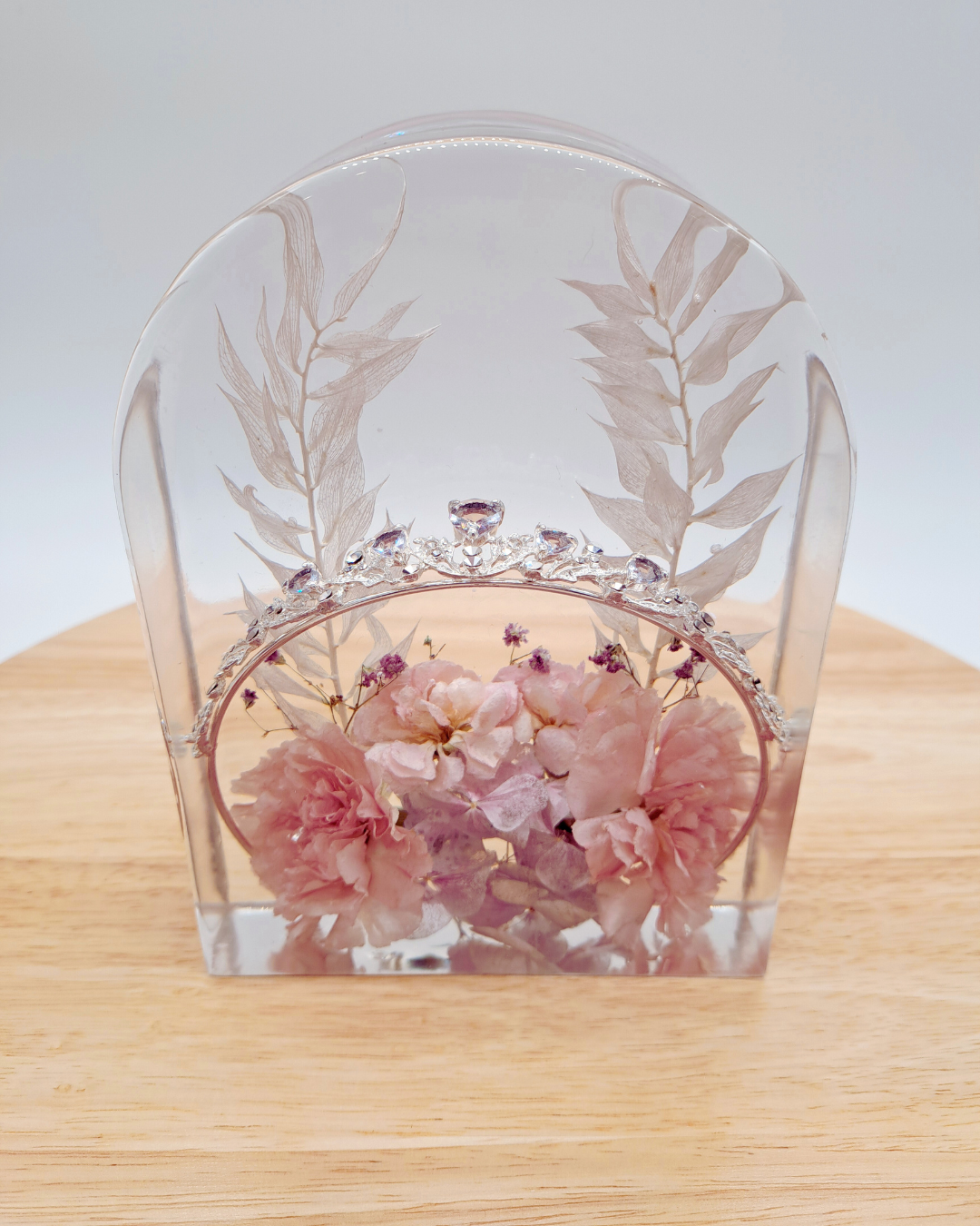 Aufsteller in Bogenform aus Epoxidharz mit eingearbeiteten, getrockneten Blumen aus dem eigenen Brautstrauß. Abmessungen ca. 12 x 17 cm Dauer bis zur Fertigstellung: ca. 5-6 Monate ab Eingang der Blumen bei uns.
