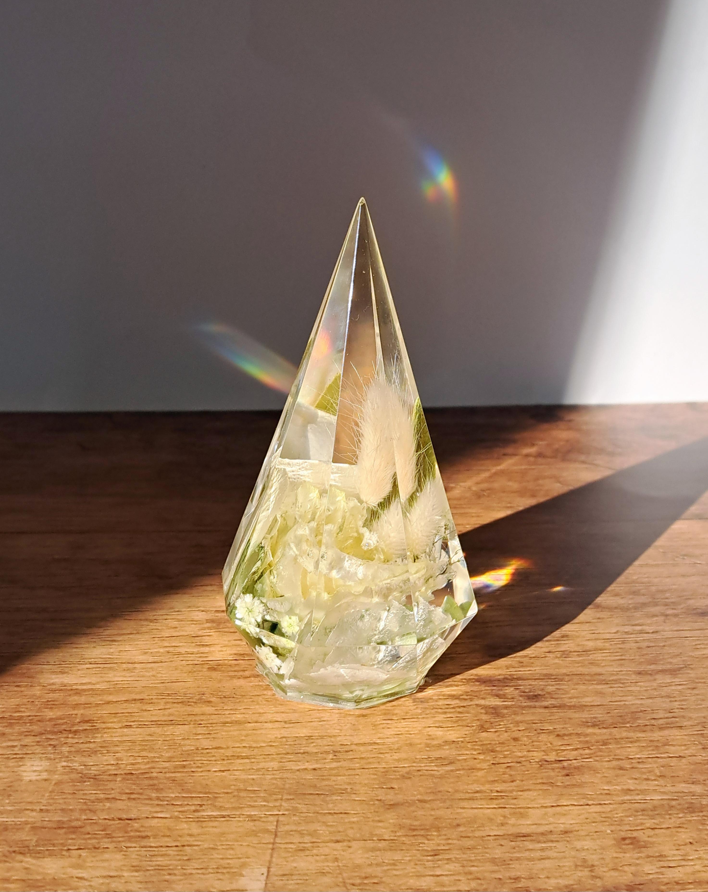 - Blumen können sich beim Eingießen in das Harz verändern.
